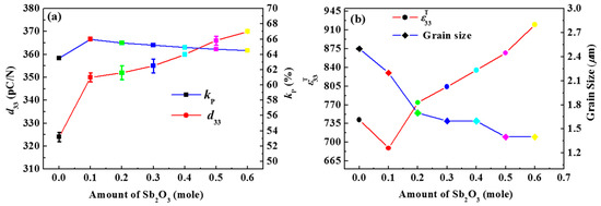 In Figure 6a, it is clear that the d33 and the kp increase with increasing amount of Sb2O3. The increased density and homogeneous grain size might be a reason for high d33 and kp. The increasing behavior of d33 with the addition of Sb2O3 into PZT was also explained by Zhou et al. [14]. In general, donor doping in PZT is expected to increase the d33 and the kp values, which is a soft effect [25]. In the previous work, it was observed that BiYO3 acts as a grain growth inhibitor as well as a donor in the vicinity of grains which improve d33 and kp in the PZT–BY system [13]. In the present case, similar trends of d33 and kp were also observed. Furthermore, the increasing tendency of d33 can be explained by the presence of second phases, as shown in Figure 1a.