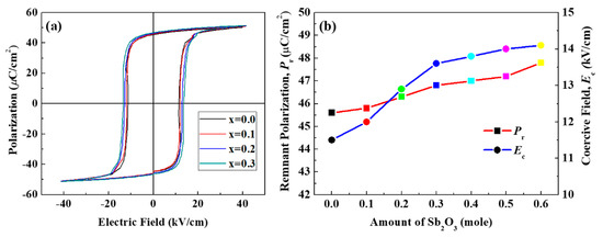 Further evidence for the Sb2O3 doping and grain size effects are obtained by examining the polarization-electric field (P-E) curve at room temperature and shown in Figure 7a. The values of Pr and Ec are determined from the measured P-E loops. The variation of Pr and Ec for undoped and Sb2O3-doped PZT–BYS(x) samples sintered at optimum temperatures are shown in Figure 7b. At 0.1 moles of Sb2O3 content, a relatively higher Pr, and lower Ec were observed. The relatively higher Pr and lower Ec at x = 0.1 could be explained by high mobility of domain walls achieved by suppression of the oxygen vacancies. Upon further increase of Sb2O3 content, Ec and Pr increases sharply. Above 0.1 moles of Sb2O3, the grain size decreases from 2.2 μm to around 1.7~1.4 μm. As a result, the clamping effect caused by internal stress below a critical grain size increases the Ec. By contrast, the increasing behavior of Pr with increasing Sb2O3 content can be explained by the presence of second phases, which is similar to the behavior of d33. It is believed that, at the higher sintering temperature, the second phases are dissociated. According to the similarities of ionic radius, the dissociated phase produces cation vacancies in PZT–BYS(x) as explained for the behavior of d33 as a function of Sb2O3 content (see Figure 6a). As a result of cation vacancies, the mobility of the domain wall increases [26] due to the sufficient displacement, which finally increases the Pr. Therefore, Pr increases at higher Sb2O3 content due to the higher concentration of the second phase in the PZT–BYS(x) system. These results are in agreement with a previous analysis of piezoelectric/dielectric properties.