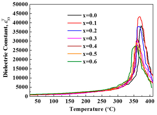 The dielectric constant (ε33T) of PZT–BYS(x) ceramics as a function of temperature is shown in Figure 8. The ε33T was almost constant up to 300 °C, and then increased gradually to a maximum value ε33T(max) at Curie temperature (TC). The TC of pure PZT is about ~360 °C. It is well known that cubic phase addition to PZT reduces TC, but in our recent work where BY was added into the PZT system, TC increased [13]. This anomaly was explained in terms of internal stress, which retarded the ferroelectric and paraelectric transition. In the present case, Sb2O3-doping has been shown to produce a linear reduction in TC. In Figure 8, it is clear that the ε33T(max) sharply decreases as the content of Sb2O3 increases and the dielectric peaks broaden around TC, which is similar to previous observations [13,37]. Similarly, Dutta et al. also explained that the broadening of the dielectric peak and variation of ε33T(max) could be attributed to the variation of grain size and some kinds of structural disorder [20]. It has already been established that, with decreasing grain size, ε33T(max) decreases, which results in the broadening of the dielectric peak, and shifts in ferroelectrics transition to higher or lower temperature sides [20,29,38].