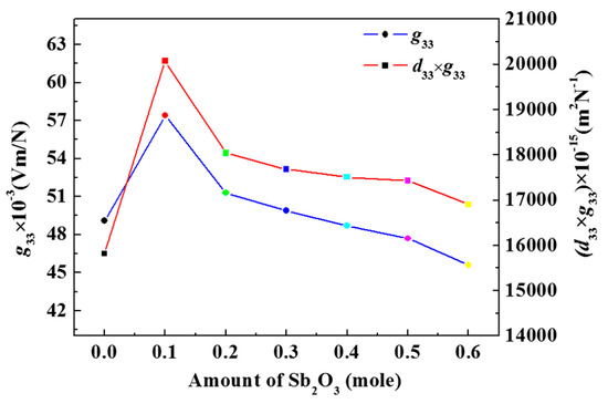 Calculated values of g33 and d33 × g33 of PZT–BYS(x) ceramics as a function of different Sb2O3 contents.