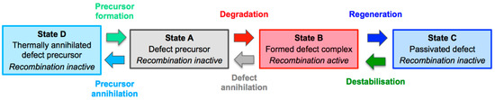 A high-level diagrammatic representation of the B-O defect system is shown in Figure 1. Four states are shown, although, in reality, the system is much more complicated. State A represents the recombination-inactive but unstable defect precursor states. State B represents the recombination-active states of the B-O defect. State C represents the regenerated state of the B-O defect stable under subsequent illumination. State D represents the thermally annihilated state of the B-O defect precursor(s), presumably species of boron and oxygen. The transition from state A to B (degradation) represents the reduction of the minority carrier lifetime with exposure to illumination. The reverse reaction from state B to A (defect annihilation) represents the unstable recovery of lifetime with dark annealing. The transition from state B to state C (regeneration) is the stable recovery of lifetime with illuminated annealing at elevated temperatures. Hence this pathway for eliminating B-O related LID requires the formation of the defect for regeneration to take place. The reverse reaction from state C to B (destabilisation) is the de-passivation of the defect from dark annealing or illuminated annealing at excessively high temperatures. It should be noted that in several publications, this reaction is drawn from state C to A, often as a two-step reaction via state B. However, the kinetics can be explained by the destabilisation reaction occurring from state C to B, with an almost immediate annihilation of the defects (B to A) given the much higher reaction rate for defect annihilation [71]. The reaction from state A to state D (precursor annihilation) represents the thermal killing of defect precursors with high-temperature processing. This transition does not appear to require the pre-formation of the defects. The reverse reaction from state D to state A (precursor formation) is the thermal formation of the precursors at intermediate temperatures.