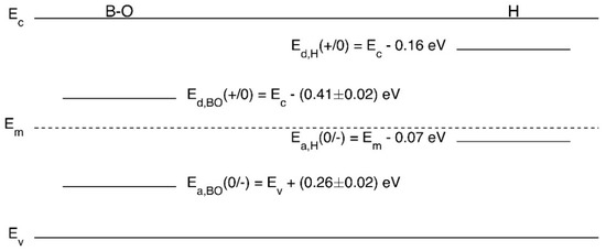 Energy level diagram for B-O defects and interstitial hydrogen showing the donor (Ed) and acceptor (Ea) levels relative to the conduction band (Ec), valence band or mid-gap (Em).