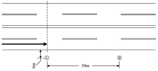 The measurements were conducted on the roadside of seven typical dry roads in Guangzhou, China, with a surface constructed of asphalt concrete. The parameters of surface could refer to the Chinese standard JTG F40-2004 (Technical Specification for Construction of Asphalt Pavements) []. To avoid possible disturbances, the samples were collected in places far away from intersections, rivers, and populated areas. The chosen urban roads have the following speed limits: 2 roads with 70 km/h, 3 roads with 60 km/h, 1 road with 50 km/h, and 1 road with 40 km/h. The spectrum was captured when the A-weighted sound pressure level during a vehicle pass-by was at its maximum, and the sampling frequency of sound level meter was 23 Hz, i.e., 23 spectra per second. Only one vehicle was measured at a time. In Figure 1, the locations of the measurement sites are shown. Both sites were 1.2 m high and 6 m to the roadside with a distance of 50 m to each other. In the experiment, the subject vehicles only moved from left to right alone. As the single vehicle passed by measurement site 1, the noise spectrum data were recorded by a digital noise recorder. The vehicle speed had little variation between points 1 and 2 while traveling on a long-straight road with a very sparse traffic flow. The vehicle speed was detected by a laser speedometer at measurement site 2.