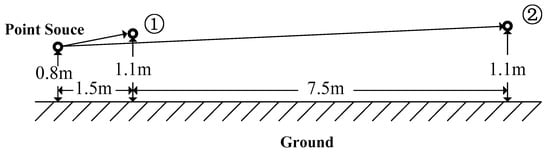To obtain the actual value of diffraction, noise attenuation as a function of distance between the two measurement sites should be considered. The noise data were measured in an open space near the sound barrier to avoid possible errors introduced by the change of the experimental locations. Because noise attenuation with distance is independent of the frequency of the sound source [], the sound source audios were merged into three categories in the experiment: heavy car, middle car, and light car. The geometric configuration of measurement is shown in Figure 4.