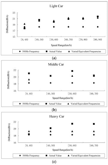 Comparisons between 500 Hz frequency and the variety of equivalent frequencies for diffraction by barrier. (a) light vehicle; (b) middle vehicle; (c) heavy vehicle.