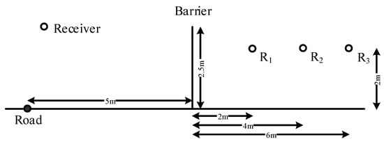 As shown in Figure 6, there is a two-dimensional sound field involving a sufficiently long enough sound barrier and a line road traffic noise source that is parallel to both the sound barrier and the ground. Three receivers (R1, R2, and R3) are chosen to analyze the effect of a road noise barrier with different type constituents and flow speed; all the receivers are sheltered by the barrier. The insertion losses of all receivers are calculated with different flow speed and the proportion of heavy vehicles. For each point, the SPL is calculated. The insertion loss of barrier can be defined as (Equation (12))