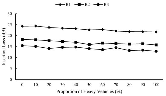 With different proportions of heavy vehicles, the insertion losses at three points are shown in Figure 7. LD presents a distinct pattern regarding points R1, R2, and R3, and the insertion loss at all of the receivers have relationships with the proportion of heavy vehicles. For point 1, LD and heavy vehicles a (%) follow the linear relationship of LD = −0.0293a + 24.661, i.e., 10 percent of heavy vehicles can cause a 0.29 dB decline on insertion loss in this scene. The results show that the SPL behind a barrier of a heavy vehicle flow is approximately 2.3 dB higher than that a light vehicle flow with the same source emission intensity. The same rule is also applicable to the overall shadow area. The heavy vehicles have more acoustical constituents at low frequencies compared to light vehicles, which are more significantly shaded by barriers. The insertion loss of heavy vehicle flow is the highest, followed by the insertion loss of mixed traffic flow, and the insertion loss of light vehicle flow is the lowest; this result indicates that the lower-frequency sound can bypass the barrier more easily. Thus, flow control of heavy vehicles whose sound is concentrated in low frequencies is an effective measure to improve the acoustic environment near roadways.