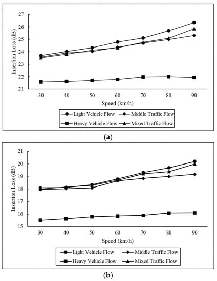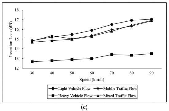 - Figure 8 clearly shows that the noise barrier has sound-shading effects in all situations. The trend of increase of insertion loss with speed is observed, and the trend is considerably more obvious for light vehicle flow, middle traffic flow, and mixed traffic flow compared to heavy vehicle flow. The added LD value at R1 of a 30–90 km/h speed range of light vehicle flow, middle traffic flow, and mixed traffic flow is 2.65 dB, 1.73 dB, and 2.33 dB, respectively. However, the added insertion loss value of the same speed range of heavy vehicle flow is only 0.36 dB, which is considerably smaller. The data at R2 and R3 present the same rule because the main acoustics of light vehicle and middle vehicle are shifted to higher frequencies, whereas the main acoustics of heavy vehicle are slightly changed in frequency.
