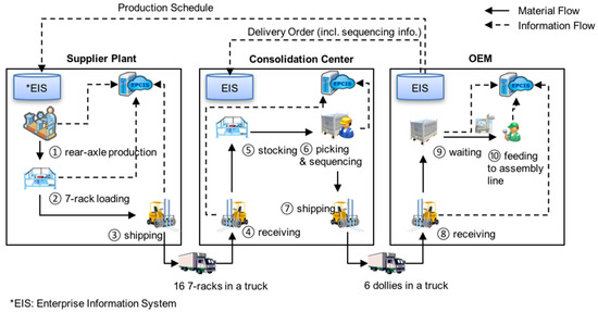 As shown in Figure 2, the entire supply chain comprises three sites: a supplier plant, a consolidation center, and an OEM plant. The target parts are rear axles, and they are supplied to the OEM after sequencing at the consolidation center, which requires attaching of an RFID metal tag at the supplier plant. Visual marks are printed on RFID metal tags so that the types of rear axles can be identified by sequencing workers. The first site, i.e., the supplier plant has three RFID read points: production, 7-rack loading, and shipping. In the 7-rack loading stage, seven rear axles are loaded onto a single 7-rack. At the second site, i.e., the consolidation center, the receiving, stocking, picking, and sequencing stages are conducted. Excluding the stocking stage, the RFID’s are read in the other three stages. In the sequencing stage, five parts are loaded on a dolly, which is a portable container. The sequencing workers visually check the marks of RFID metal tags attached at the supplier plant and sequentially load the rear axles on the dollies based on the sequence information provided by the OEM about an hour in advance. Because of the importance of sequencing accuracy, currently, manual inspections are conducted to detect sequencing errors by reading five rear axles on a pertinent dolly with a barcode reader after completing the sequencing; in this study, a system was developed to check the sequencing errors automatically by using an RFID reader. Lastly, at the OEM, four processes, namely, receiving, dolly waiting, dolly towing, and assembly-line feeding, are conducted, and the RFID’s are read in the receiving and assembly-line feeding stages only.