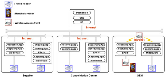 As shown in Figure 3, the structure of the system follows the EPCglobal architecture model, which is a standard model of RFID information services including EPCIS, ONS, and DS. It was completed by additionally developing application programs for production, shipping, receiving, and sequencing.