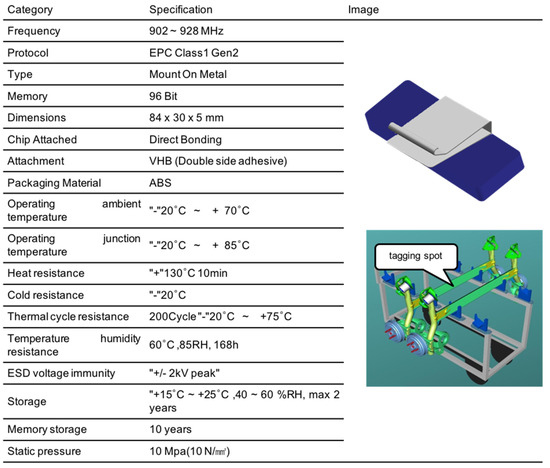 For stable identification of RFID on the metal, we designed clip-type RFID metal tags and applied them on the top right side of rear axles. In order to reuse the tags, workers at the OEM plant need to detach the tags before assembly-line feeding and return them to the supplier plant via delivery trucks returning with the empty racks. Figure 4 shows the detailed specification and shape of the metal tags.