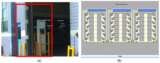 When the rear axles arrive at the consolidation center, an information flow similar to that of the shipping process at the supplier plant is created. As shown in Figure 8a, the ID’s of the 7-racks loaded in three layers are read, and after fetching the ID’s of the children rear axles by querying the supplier plant’s EPCIS about the ID’s of the 7-rack with the parent key (at ⑦ in Figure 7), the receiving process is carried out by storing the ID’s of rear axles in the consolidation center’s EPCIS. As in the previous stage, the workers can monitor the receiving status through an application shown in Figure 8b.