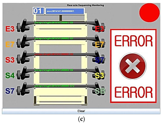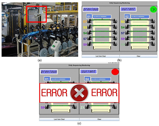 After the dollies containing the rear axles arrive at the OEM plant, dolly sequencing is carried out when they are fed to the assembly line. The order in which the dollies are fed is checked (the sequences of the rear axles loaded on the dollies have already been checked at the consolidation center) using the equipment shown in Figure 10a to prevent any sequencing errors. Figure 10b,c represent the screen shots of the dolly sequencing application in the cases of both no-error and error.