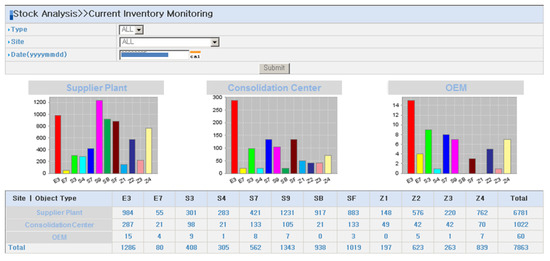 The constructed RFID system facilitates not only sequence checking but also real-time inventory monitoring, as shown in Figure 11. The pertinent application aggregates and reports current inventory information based on the receiving or shipping RFID event data stored in the EPCIS installed at each site. The inventory at each plant can be monitored automatically from an office instead of having workers at the consolidation center check the inventory every morning and share the inventory information with the managers so that they can plan the daily production schedule of the supplier plant. Consequently, the inventory-checking time of workers at the consolidation center and the inventory errors are reduced, and real-time production planning and inventory control become possible.
