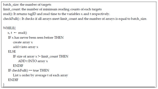 Regular RFID antennas are designed for recognizing several tags simultaneously. In other words, they are designed to read as many tags as possible within the recognition range. However, if the regular antennas are used as they are in the sequencing work, the tags cannot be read in an orderly manner, and sequencing errors cannot be determined accurately. In order to recognize the correct sequence of RFIDs in a row, we used an RFID sequence-checking algorithm which is proposed in [23]. The algorithm is based on the read frequency (i.e., the number of successful reads in a predefined cycle time). Figure 12 summarizes the sequence-checking algorithm for RFID. The basic concept of this algorithm is that as the rear axles loaded onto the dolly sequentially pass through the RFID sequence-checking device, the reading sequence is determined by considering the average of the RFID read times. While a dolly passes through the sequence-checking zone, the reader repeats read cycles, during each of which the reader can read the ID’s multiple times (called read count). The read counts of each ID over the repeating read cycles generate a time-domain profile of read counts. Sometimes the rear axles placed in the back of the dolly are read before those placed in the front, but in this case, the recognition frequency (the number of successful reads) is very low. Therefore, the average read time values can clearly determine the sequence of RFID tags. The robustness of this algorithm was verified through experiments in [24].