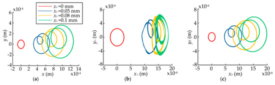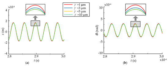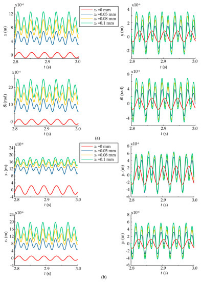 - The static displacement eccentricity has a great effect on the system and the orbits of the rotor and bearings are center circles when the static displacement eccentricity is zero, while they become irregular and lager when the eccentricity exists. The bearing closer to the rotor can be affected more easily when the rotor is not in the middle of the shaft. The dynamic responses increase nonlinearly with the eccentricity and rotor offset due to the effects of UMP and bearing forces. When the radial clearance increases within a certain range, the dynamic responses of the rotor and the bearing farther away from the rotor decrease, while the dynamic responses of the bearing closer to the rotor increase. When the radial clearance reaches a certain value, the dynamic responses of the system will no longer be changed since the effects of the bearings disappear.
