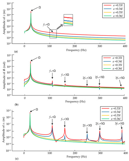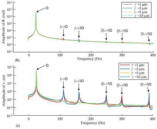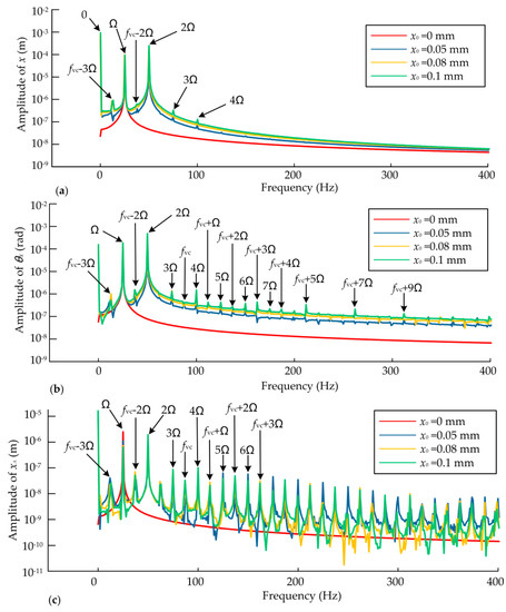 - The main frequencies of dynamic responses are the rotating frequency and the double rotating frequency when the static displacement eccentricity exists and the frequency components of the bearing are more complex, while the main frequency is the rotating frequency when the static eccentricity is zero. Moreover, high integer multiples of rotating frequency can be found with the increase of static displacement eccentricity. The combination of VC frequency and odd multiples of rotating frequency can be observed more obviously than other combined frequencies due to the coupling effects, and the coupling effects on the bearings are greater.