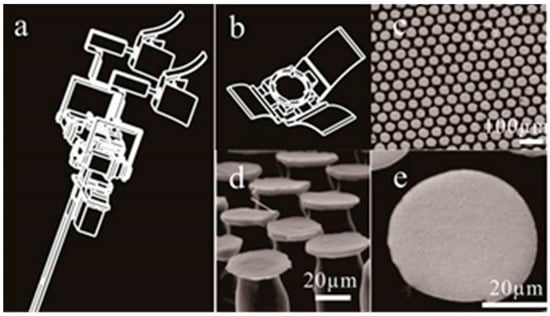 Structural hierarchy of the biologically inspired robot adhesive system. (a) Gecko-inspired robot; (b) Footpad of the robot; (c–e) Biomimetic mushroom-shaped adhesive microstructure (MSAMS) made of PVS (reproduced with permission from [10]. Copyright the Royal Society, 2007).