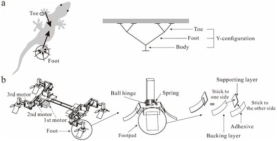 (a) Arrangement of toes in the gecko walking on a ceiling surface reveals the utilization of a particular Y-configuration in both toes and feet; (b) Mechanical structure of the legged robot and its footpad.