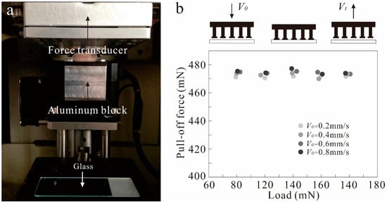 (a) Image of the setup used to measure the pull-off force; (b) The pull-off force measured between mushroom-shaped adhesive microstructure (MSAMS) and glass as a function of load at different load velocities.