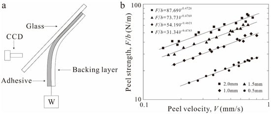 Results of the peeling test. (a) Schematic diagram of the peeling experiment; (b) The relationship between peel strength and peel velocity at a peeling angle of 30° with different thicknesses of backing layer in log-log coordinates.