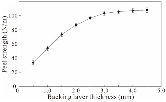 The influences of backing layer thickness on the peel strength at a peeling angle of 30° and at a peeling velocity of 2 mm/s.
