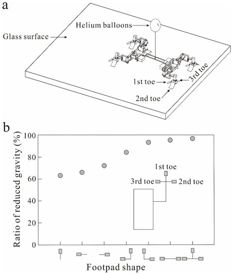 Helium balloons which are fixed on the center of mass of the robot were used to reduce gravity. The climbing abilities of the robot under different conditions under reduced gravity were tested to verify the performance of the toes (Figure 6a). Here we define a ratio (µ) of reduced gravity (RRG):