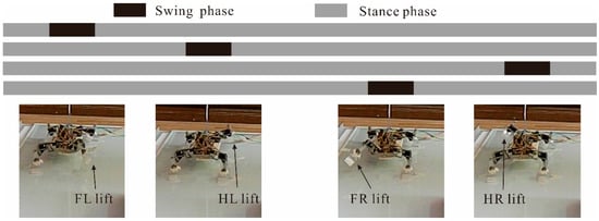 In order to test climbing ability of the robot under reduced gravity, the balloons were used to fully balance the robot’s weight, as shown in Figure 9. The size of the toe is 2 cm × 4 cm. Our experiment shows that the robot can climb under mimic zero gravity at the velocity of up to 1 cm/s with diagonal gait (Duty factor is 0.6). When the velocity of the increased up to 2 cm/s, the robot was slipped and become unstable. This is because as the velocity increases, peel strength also increases, which leads to larger peeling force.