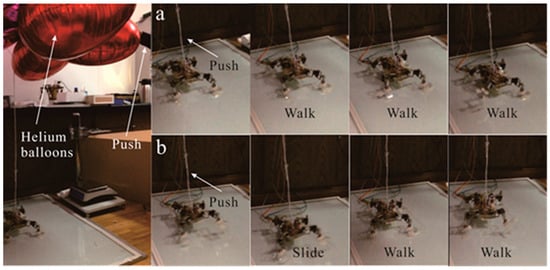 We push the balloons in side direction slowly and quickly, respectively, to test the climbing performance at the lateral impact. When we pushed the balloons slowly, there was no slip observed during climbing. The climbing performance was not affected by such a lateral impact, and the robot could continue to move forward (Figure 8a) (Supplementary video 2). When we pushed balloons quickly, the robot slipped off, but did not fall down within a short distance in lateral direction (Figure 8b). Then, the robot recovered quickly and continued forward motion. These results demonstrate an enhanced self-balancing ability of the robot with multiple toes. It demonstrated feasibility of the multi-toe footpad and its higher reliability in the climbing performance under reduced gravity.