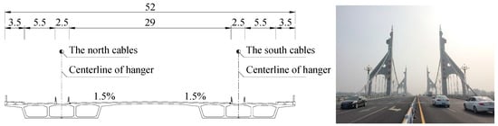 The layout of Hunan Road Bridge and girder geometry are shown in Figure 1 and Figure 2, respectively. The span arrangement is 53 m + 112 m + 53 m = 218 m. The prestressed concrete girder is composed of two box beams having three cells. The main girder with a width of 52 m is currently the widest among similar bridges in China. The longitudinal and transverse slopes of main girder are 2.5% and 1.5%, respectively. The rise-span ratio of the mid-span and side-span are 1/5.276 and 1/12.965, respectively. The towers are transversely connected by the crossbeams. The lateral distance between the two cable planes is 31.7 m. Crossbeams are densely arranged with an interval of 5 m in the main girder corresponding to the hangers. The numbers beginning with CS in Figure 1 represent the girder cross section located at the towers, girder endpoints, sidespan midpoints, and the quarter points of mid-span, respectively. The hangers on the north and south side are numbered as DS1-N–DS37-N and DS1-S–DS37-S, respectively, which will be used in the following analysis.