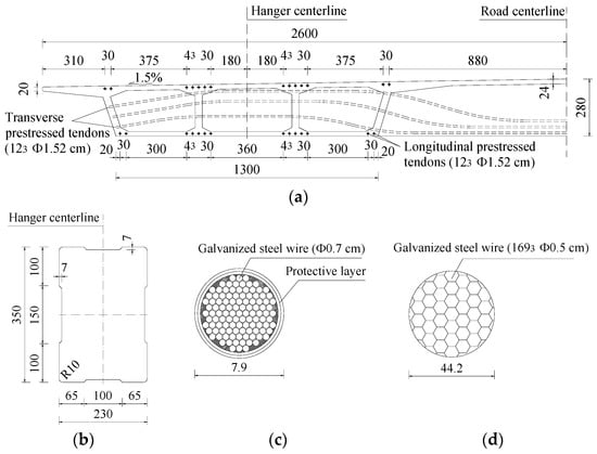 The detailed cross sections of the key components are shown in Figure 3, including the main girder, tower, hanger, and cable. The standard cube compressive strengths of the concrete materials used in the main girder and tower are 50 MPa and 40 MPa, respectively. The tensile strengths of the steel wires used in the prestressed tendon and cable system are 1860 MPa and 1670 MPa, respectively.