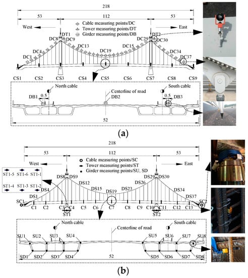This section introduces the health monitoring system for the Hunan Road Bridge. The measured data obtained from this system will be analyzed in the following sections. The sensing variables contained the ambient temperature, structural temperature field, and structural responses. The structural responses included the deformations, stresses, and vibration characteristics of key components. The sensing variables were measured periodically every three months using the devices deployed during the construction control period. The layouts of measuring points are shown as Figure 4.
