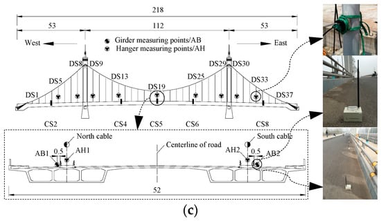 It has become a trend to put equal emphasis on bridge’s attractiveness and practicability. The concrete self-anchored suspension bridge is becoming competitive among the numerous bridge types, because of its economy, elegant appearance, and reasonable force transmission form [1,2,3]. Since most of the self-anchored suspension bridges are built in the thoroughfare of city transportation, the growth of traffic volume prompts the girder width to increase to 50 m or even more to meet the increasing lane requirements. The reliability of bridge is related to the lives of thousands of people and significant social impacts. The inevitable structural damages that are caused by the human factors, vehicle loads, and time-dependent effects will affect the bearing capacity and the durability of bridge [4]. The structural health monitoring (SHM) and safety evaluation are very necessary during the bridge service period.