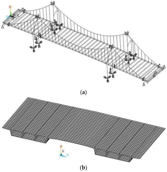 The finite element (FE) model of Hunan Road Bridge was established using the ANSYS program as shown in Figure 5. The hanger forces and cable alignments were set based on the field measured data in the bridge completion state [45,46].