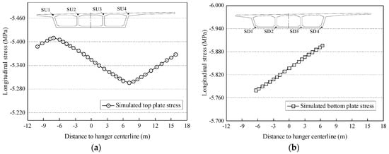 The simulation results of the girder longitudinal stresses at mid-span section CS5 in bridge completion state are shown in Figure 6, which demonstrates the distributions of the stresses of the top and bottom plate along transverse direction. The stresses of the hotspots were obtained through controlling the section mesh of beam 188 element. In addition, the torsional effects of the extra-wide concrete girder were captured by the beam element adopted, while the shear lag effects were neglected, which may only be caught with a refined FE model using the solid of shell finite element. However, the refined FE model is not suitable for the prediction analysis of long-time concrete S&C effects for such a complicated self-anchored suspension bridge because of the huge computational time that is required.