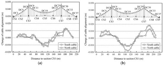 Measured changes of cable alignments during the one-year period from April 2015 to April 2016: (a) First half year period; and (b) One-year period.