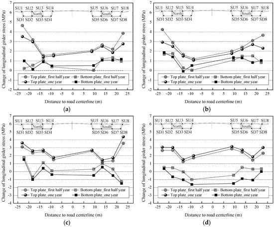 The measured variations of girder longitudinal stresses are shown in Figure 9. As shown in Figure 9a,b, the compressive stresses of side-span girder generally increased during the first half year affected by the concrete shrinkage and elastic compression of girder under the huge horizontal cable forces. Then, the compressive stresses of side-span girder top plate decreased slightly after the first year, which was caused by the rise of side-span girder along with the cables that were affected by the movements of cable anchoring positions towards the mid-span. As for the side-span girder bottom plate, the compressive stresses of the measuring points including SD2, SD3, SD6 and SD7, which are close to the hanger points, also decreased slightly after the first year along with the decreased horizontal cable forces. However, the stresses of SD1, SD4, SD5 and SD8, which are far away from the hanger points, increased continually because the influences brought by the cable force changes were weak. The uneven transverse distributions of stress changes reflect the significant spatial effect of the extra-wide girder.