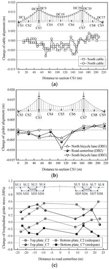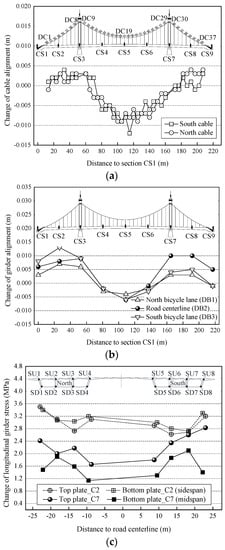 The measured changes of structural alignments and girder compressive stresses are shown in Figure 10. The mid-span cables and girder dropped slightly, as shown in Figure 10a,b. The cable catenary sag increased along with the thermal expansions of steel wires and increases in cable length. In terms of the east side-span, the thermal expansion of concrete was caused by the ambient warming simultaneously besides the increases in cable catenary sag. The cable anchoring positions at girder ends moved towards the expansion joints. The cables and girder rose affected by the thermal expansion of mid-span girder and bidirectional sliding bearings between the east towers and girder. As for the west side-span, the bearings between the west towers and girder were transverse one-way sliding bearings. The additional movements of west cable anchoring positions that are caused by the thermal expansion of mid-span girder were relatively smaller when compared with the east ones. Thus, the structural alignments changed insignificantly.