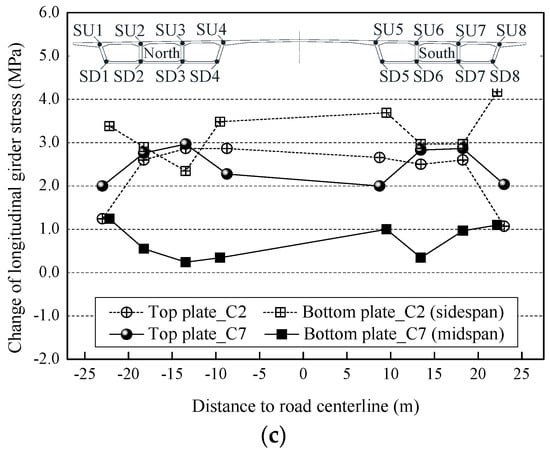 The measured changes of girder compressive stresses are shown in Figure 10c. In terms of the side-span girder, the compressive stresses increased affected by concrete thermal expansion and constrains brought by expansion joints. As for the mid-span girder, the top plate compressive stresses increased, and the bottom plate stresses decreased affected by the girder deflection. The uneven changes of the girder stresses between the side and middle webs of the same cross section caused by the temperature gradients reflect the significant spatial effect of the extra-wide girder.