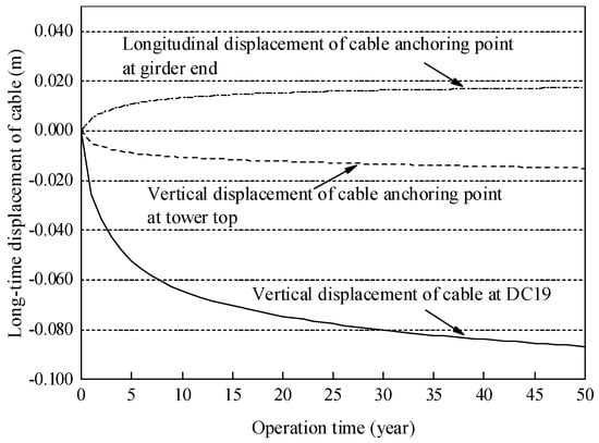 The predicted long-time displacements of the cable and cable anchoring points affected by concrete S&C are shown in Figure 13. The reliability of the calculation was validated by comparing the calculated displacement of cable at DC19 of −0.026 m after the first year with the measured data of −0.018 m shown in Figure 7b. The displacements of the cable anchoring positions at girder ends towards the mid-span and the drops of anchoring positions at tower tops will be caused by the concrete elastic compression and S&C deformation. Significant vertical displacements of the middle mid-span cables will be caused by the movements of cable anchoring positions at tower tops towards the mid-span and the unbalance horizontal cable forces.