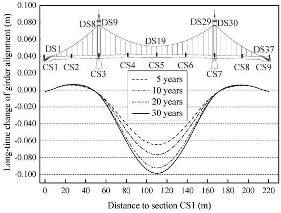 The predicted long-time changes of girder alignments are shown in Figure 14. The mid-span girder deflections will increase continually, and the girder deflection at CS5 is the most significant. The side-span girder will rise slightly along with the rise of cable. The girder deflections present a change trend of increasing quickly firstly and then slowing down.
