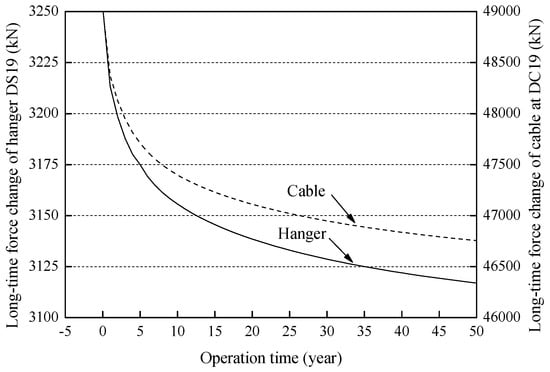 The predicted changes of the hanger and cable forces at middle mid-span DS19 are shown in Figure 16. The internal forces of hanger and cable at DS19 will decrease by 4.2% and 4.6% after 50 years, respectively. The change rates will tend to be 0 approximatively, namely the cable system becomes more and more stable.