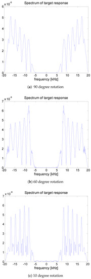 Magnitude spectra of the target response for various rotation angles for an linearly frequency modulated (LFM) signal of 13 kHz center frequency and 14 kHz bandwidth.