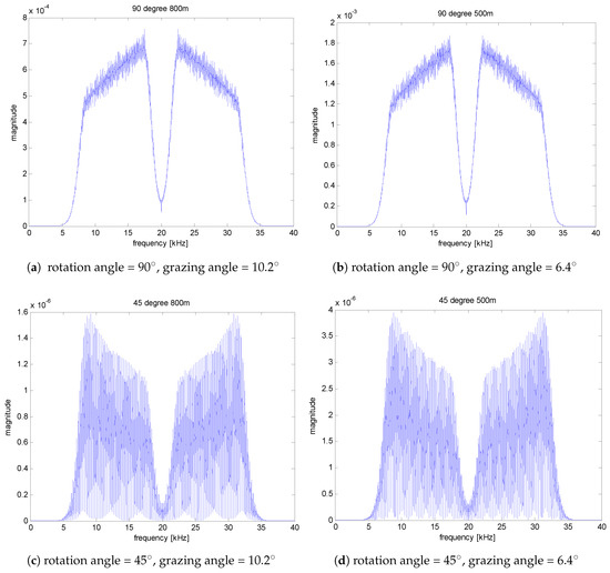 For generating a feature vector for the logistic regression model, the DFT is applied to the matched filtering output of the sonar, the magnitude of this DFT result is used as a feature. The target strength is shown in Figure 3 according to the rotation angle of the target with respect to the incident signal. A significant change in target strength can be observed depending on the angle. Figure 4 shows examples of the magnitude spectrum for the received signal for rotation angles of 10 degrees, 60 degrees, and 90 degrees, respectively. It is observed that the spectrum varies depending on the angle. The feature vector reflecting these spectral characteristics are utilized in the logistic regression model. Note that the target response is depending on the grazing angle from the sonar. However, since the water depth is 100 m and the target is located in the range from 500 m to 800 m in this study, the grazing angle varies from 10.2 to 6.4, which does not make a notable difference in the spectrum, as observed in Figure 5.
