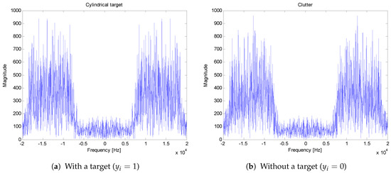 Whenever one feature vector with is generated, the same condition is applied to the generation of the corresponding clutter signal and another clutter signal with the same power of the target signal for a given TCR is generated and added to the clutter signal . Note that each signal consists of 1501 samples and DFT is performed to obtain a magnitude of each frequency band to construct a feature vector. Figure 6 shows an example of the time domain waveform pair with (Figure 6a) and (Figure 6b). The two waveforms are very similar and the magnitude spectra of the two waveforms shown in Figure 6 are shown in Figure 7. It is difficult to discriminate one from another. However, the magnitude spectrum in Figure 7a has a specific spectrum structure as shown in Figure 4.