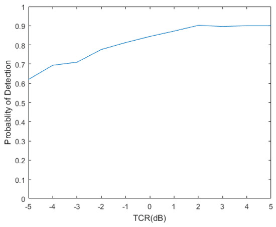 In addition, AUC values according to TCR are displayed in Figure 12. The minimum is 0.74 at TCR = −5 dB while the maximum is 0.94 at TCR = 3 dB. As the target signal power is getting better over the clutter power, AUC improves, which shows excellent discrimination. The probability of detection is plotted with respect to TCR in Figure 13, where the detection probability of 0.62 at TCR of −5 dB is observed, while, for TCR greater than or equal to 2 dB, the detection probability of about 0.9 is maintained.