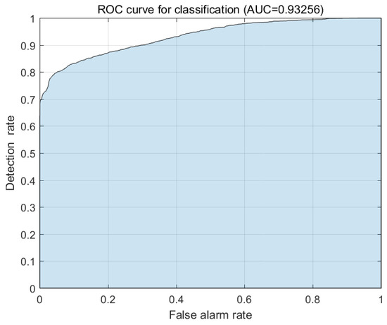 As mentioned above, for 1000 simulations, the simulated data that are classified as target signals are utilized as target feature vectors while the remaining simulated data and the Rock 2 measurements are done as clutter feature vectors. Before training the logistic regression model, PCA is applied to the training vectors to obtain 31 principal components with explained variance of 0.99. In the simulations, the test data consists of 2520 cylinder feature vectors and 3600 feature vectors of the Rock 2 measurements. For 1000 simulations, the mean of AUCs is 0.9325 with its standard deviation of 0.0038. One of the 1000 ROC curves is shown in Figure 15. As mentioned above, the AUC of 0.9325 indicates that the model achieves outstanding discrimination performance [14].