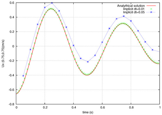Temporal evolution of the horizontal velocity at (x, y) = (0.75, 0.75). Implicit second order backward differentiation formula (BDF2) scheme.