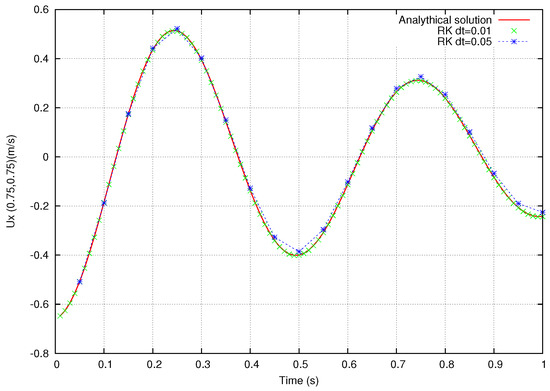 Temporal evolution of the horizontal velocity at (x, y) = (0.75, 0.75). Semi-explicit Runge–Kutta scheme.