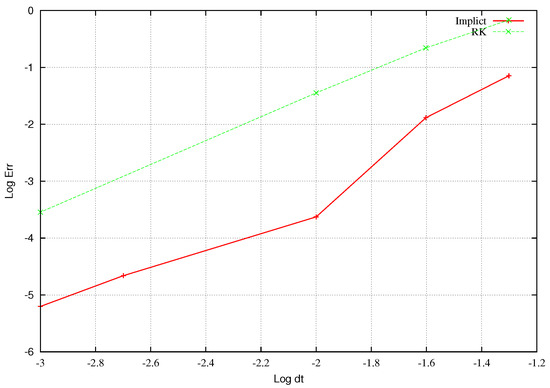 One can see that both schemes exhibit quadratic convergence. However, the error introduced by the proposed method is considerably smaller than that of the implicit method for a given time step. For example, the semi-explicit Runge–Kutta scheme with = 0.01 leads to the same error as the implicit scheme with = 0.001. This indicates that provided s lower computational cost (per time step) of the semi-explicit scheme, a considerable gain in the overall computational time is expected.